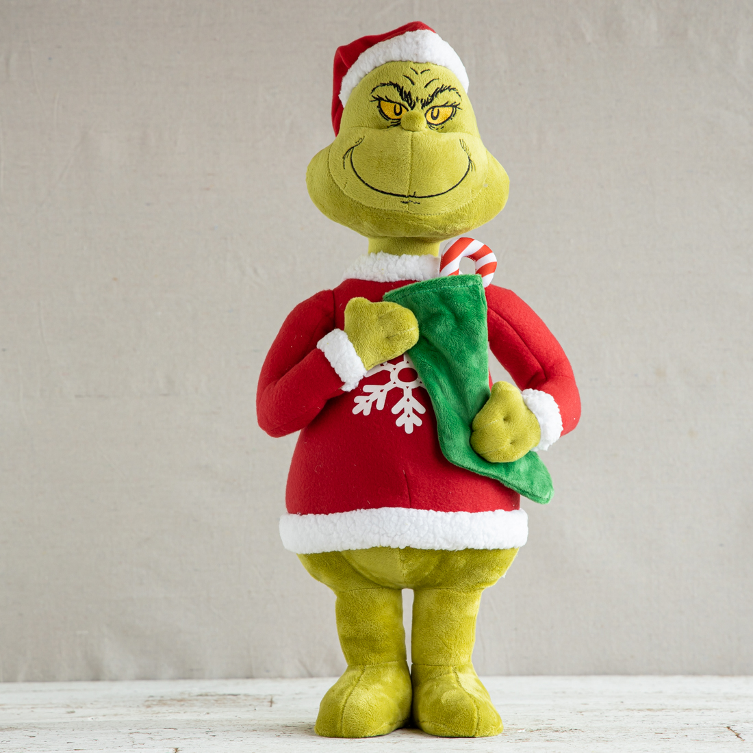 Grinch Holds A Plush Green Stocking And Candy Cane.